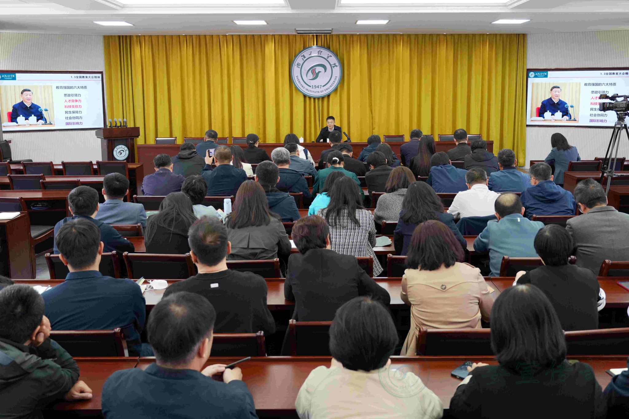 校长王国辉为“高水平应用型电力大学建设与人才培养教育教学思想大讨论”活动作工作部署与动员讲话,从“两个转型”的必要性与紧迫性出发,全面阐述了学校建设高水平应用型电力大学的历史使命与时代责任。他指出,“两个转型”是落实教育部本科教学审核评估“以评促建、以评促改”的核心要求,更是学校立足国家教育改革战略、服务辽宁全面振兴新突破、推动学校自身高质量发展的关键举措。他系统部署了本次“大讨论”聚焦的“教育教学理念更新、大思政体系建设与五育融合、高水平应用型人才培养、产教深度融合协同育人、人工智能赋能教育改革”五大核心议题,提出了打破“惯性思维”以思想破冰引领行动突围、遵循“应用原则”以问题导向推动攻坚落地、构建“责任闭环”以刚性约束保障执行力度的三项工作要求,为学校锚定了“高水平应用型电力大学”的建设方向。