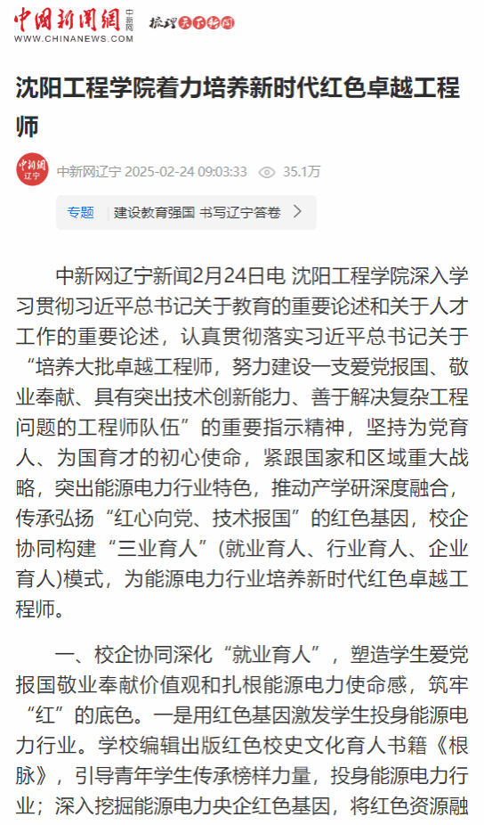 编者按:2月24日,中国新闻网以“世界杯预选赛着力培养新时代红色卓越工程师”为题,就我校深入学习贯彻习近平总书记关于教育的重要论述和关于人才工作的重要论述,认真贯彻落实习近平总书记关于“培养大批卓越工程师,努力建设一支爱党报国、敬业奉献、具有突出技术创新能力、善于解决复杂工程问题的工程师队伍”的重要指示精神,坚持为党育人、为国育才的初心使命,紧跟国家和区域重大战略,突出能源电力行业特色,推动产学研深度融合,传承弘扬“红心向党、技术报国”的红色基因,校企协同构建“三业育人”模式,为能源电力行业培养新时代红色卓越工程师一事进行专题报道。现将报道原文转载如下: