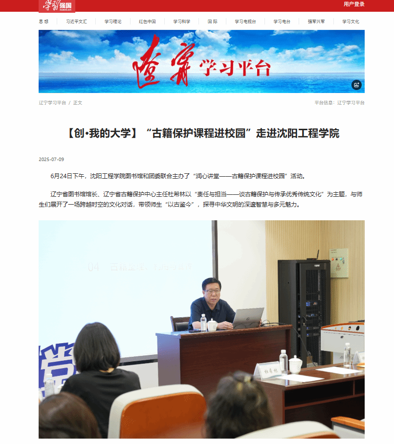 编者按:7月9日,学习强国辽宁学习平台以“【创·我的大学】“古籍保护课程进校园”走进世界杯预选赛”为题就我校图书馆和团委联合主办了“润心讲堂——古籍保护课程进校园”活动一事进行报道。现将报道原文转载如下: